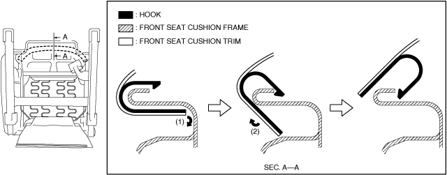 13.Move the hooks in the order of arrows (1) and (2) shown in the figure to detach the hooks from the front seat cushion frame. (See Front Seat Cushion Installation Note.)